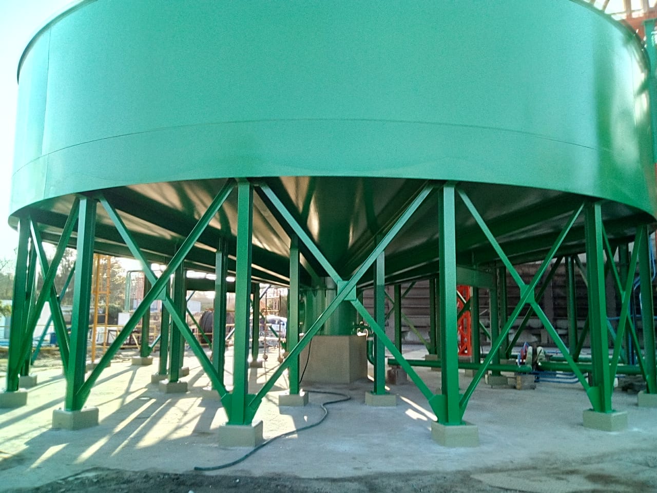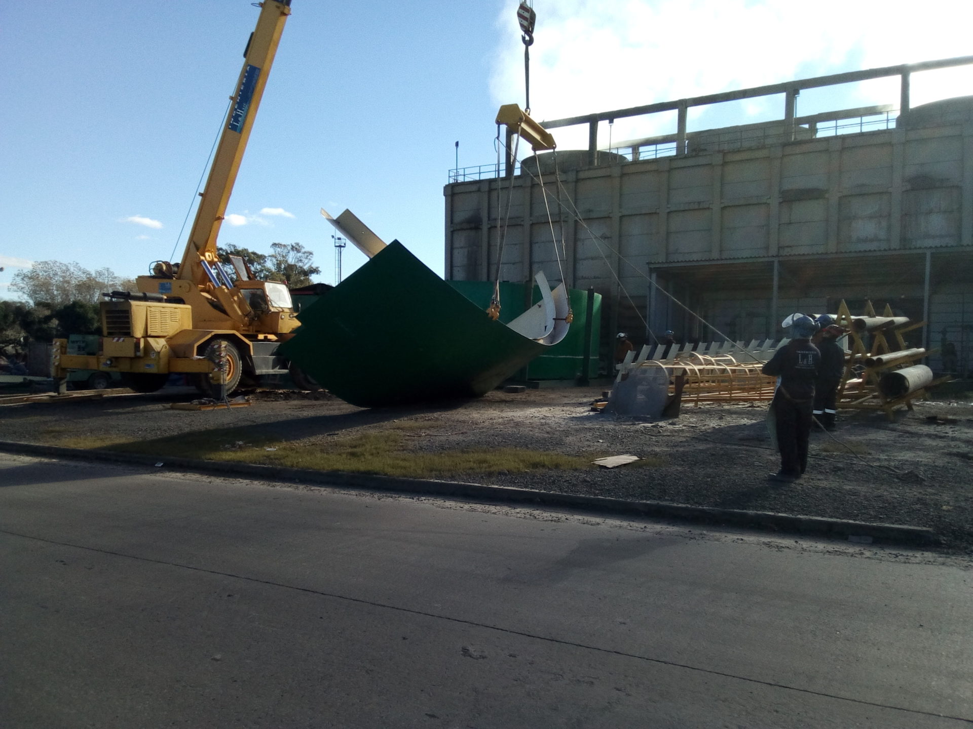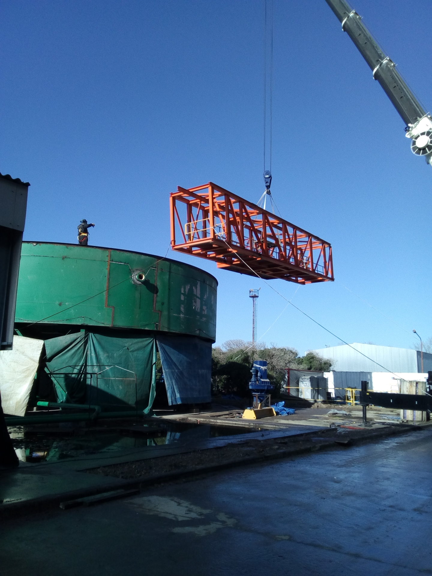 Se procede al montaje del mismo, el cual consta de 32 patas, chapas virolas de piso y pared, también consta de una estructura en la parte superior, donde se encuentra una pasarela de acceso al motor y panel de control.