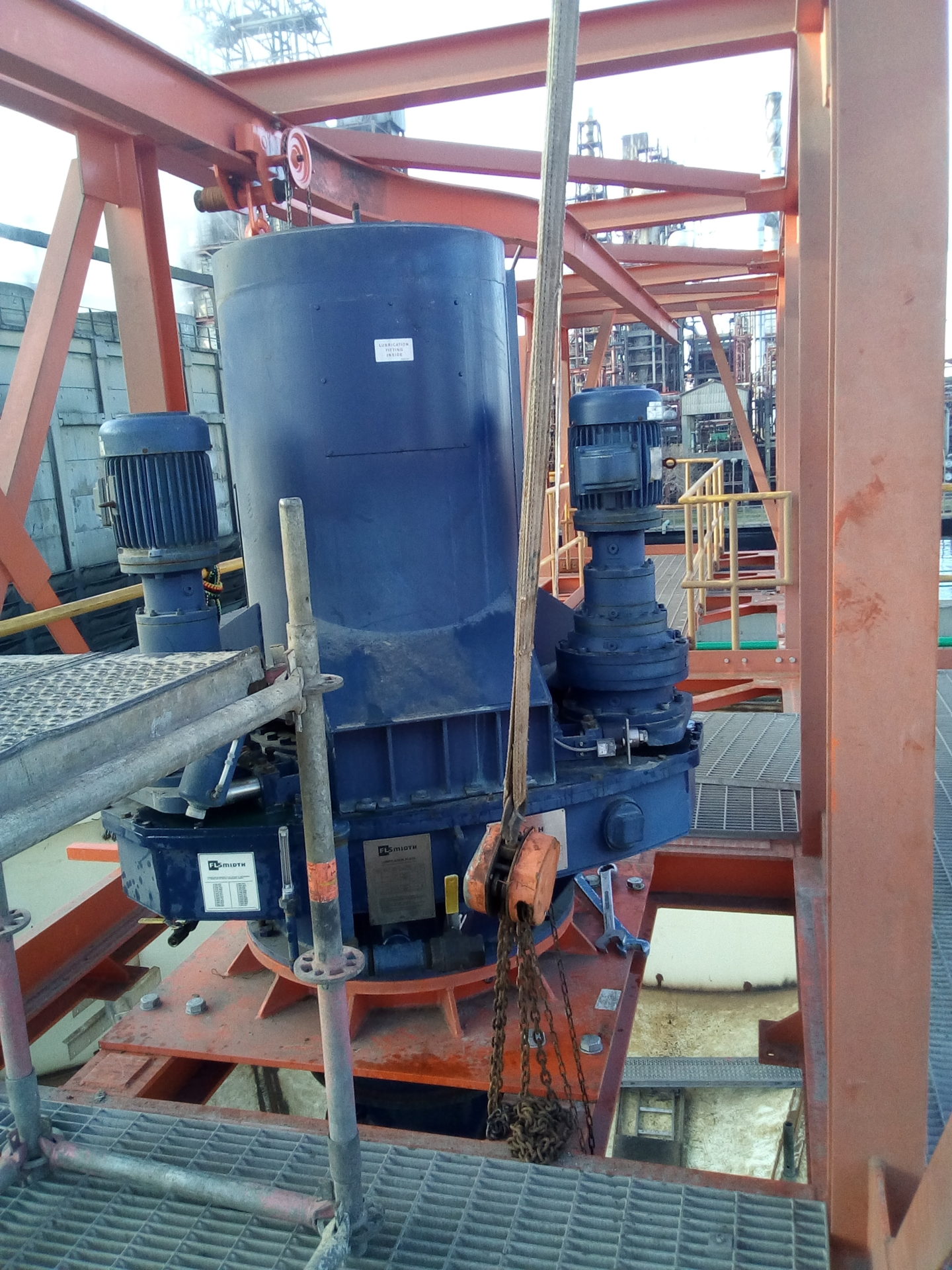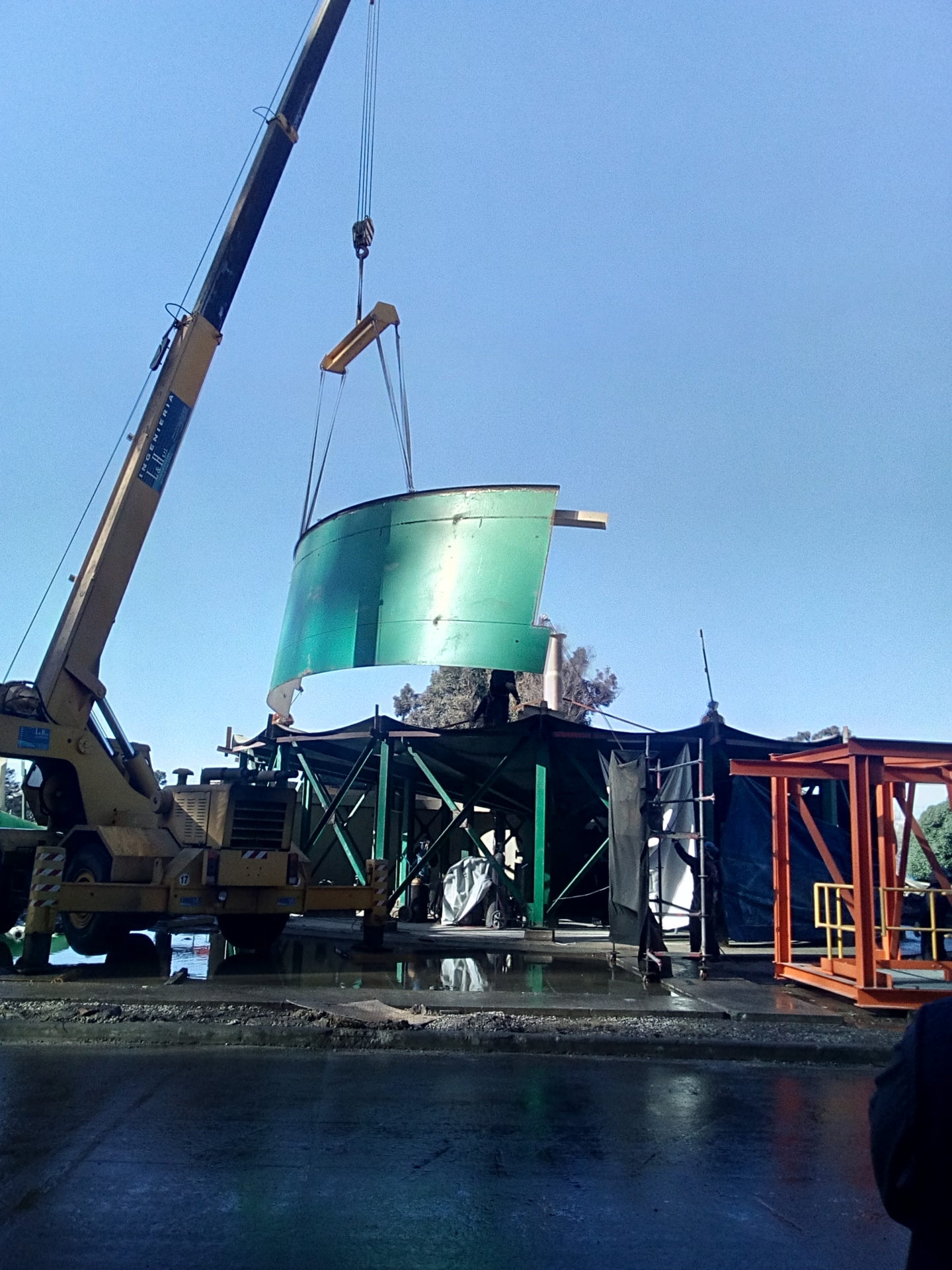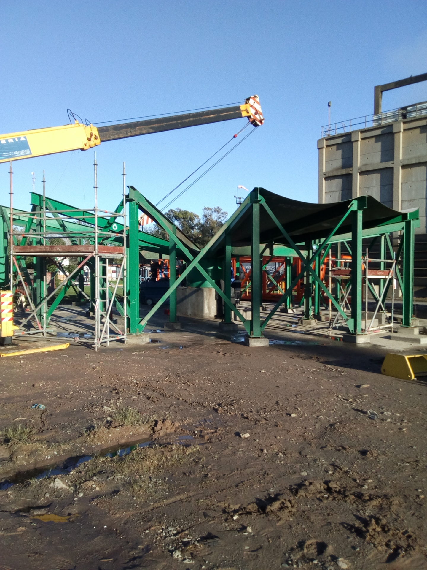 Se procede al montaje del mismo, el cual consta de 32 patas, chapas virolas de piso y pared, también consta de una estructura en la parte superior, donde se encuentra una pasarela de acceso al motor y panel de control.