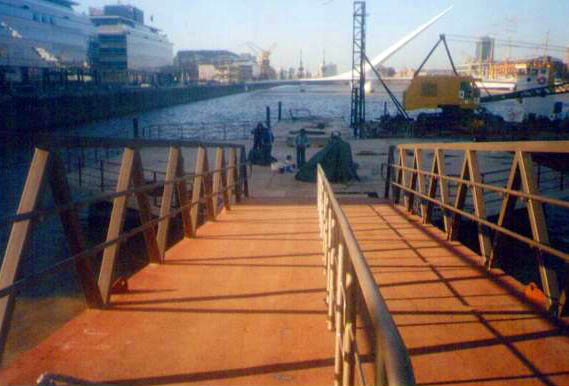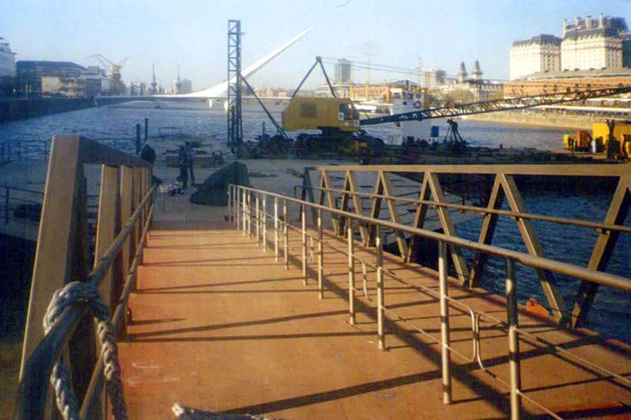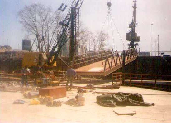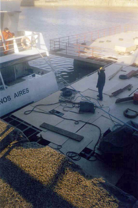 Los tres cuerpos construidos, conformaron una plataforma de 18 x 24 mts, sobre la cual se apoya la planchada. Más 2 marinas de 6 x 24 mts unidas al pontón.